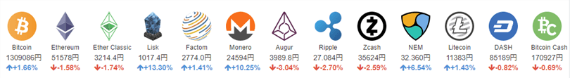 ビットコイン(BTC)・ビットコインキャッシュ(BCH)・イーサリアム(ETH)・イーサリアムクラシック(ETC)・ライトコイン(LTC)・リスク(LSK)・ファクトム(FCT)・モネロ(XMR)・オーガー(REP)・リップル(XRP)・ジーキャッシュ(ZEC)・ネム(XEM)・ダッシュ(DASH)
