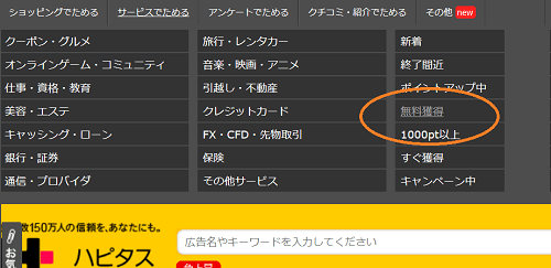 広告サービスには、無料で登録できるサイトもたくさんあります。これにはPC版の場合、一番上のメニュー「サービスでためる」から→「無料獲得」を選択して良さげな案件を探すといいでしょう。