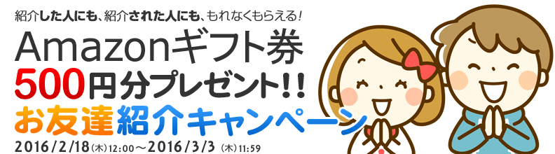 ハピタスを紹介した人と、紹介されたお友達にそれぞれもれなくAmazonギフト券500円分をプレゼント。