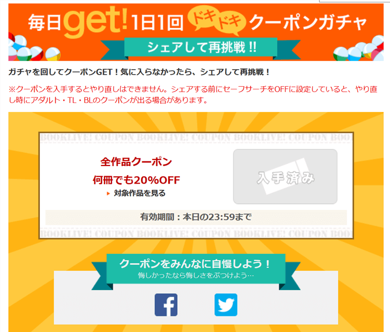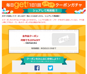 BookLive!では常に何らかの割引キャンペーンが行われている上に、毎日1回無料で回せるクーポンガチャがある。これにより常に10%から最大50%OFFで商品を購入することが出来るのだ(※当選したクーポンはその日限り有効です)。