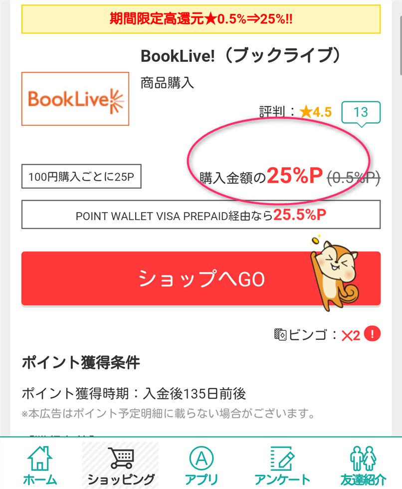 なんと25%も還元されるのです。ここまで還元率が高くなる案件はそうありません。BookLive!だけがなぜか時々、思い出したように急激に増えるのです。ちなみにこのキャンペーンは全てのポイントサイトで行われているわけではないようで現在、大幅に還元率が上がっているのはモッピーだけのようです(げん玉も以前おおきく上がったことがあったが今回は少し上がっての9%、ハピタスは通常と同じ6%還元のままである)。