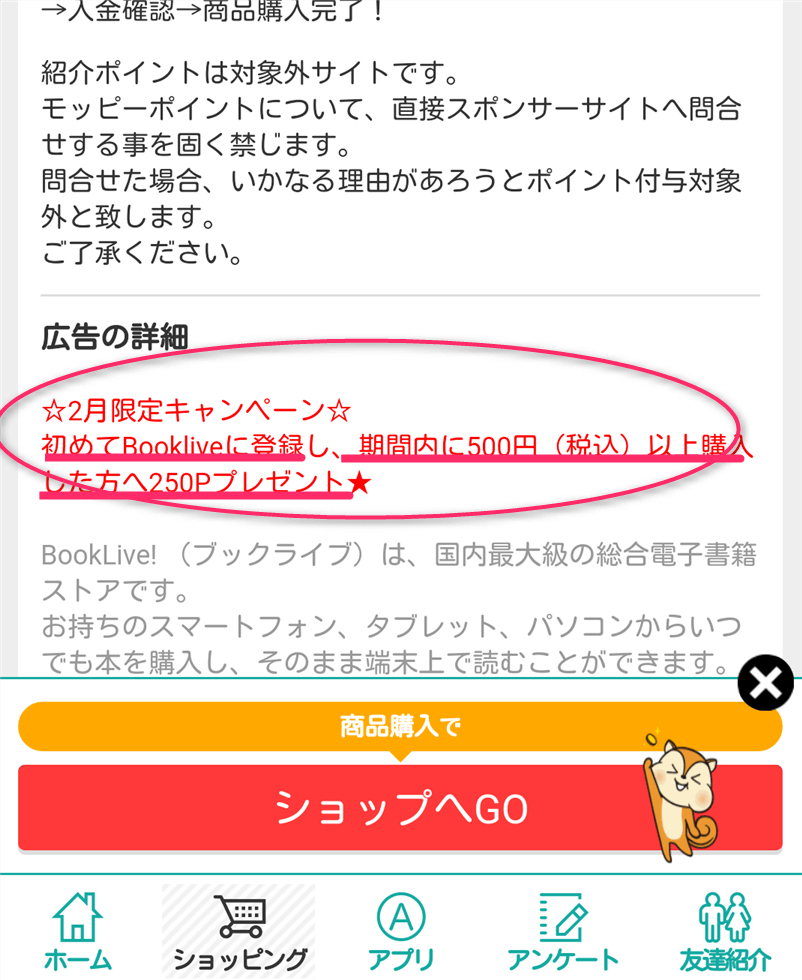 こちらもモッピーのみの期間限定ですが(2月限定なのでもうすぐ終わっちゃう⇒3月もやってくれるってよ)初回会員登録後、500円分以上の購入で、250円分のポイントがもらえるキャンペーンも同時開催中である。
