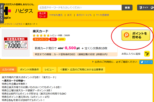 “ポイントを貯めるボタン”をクリックし、公式サイトから楽天カード発行の手続きをすると、現時点でハピタスから8,500円分のポイントに、楽天から楽天スーパーポイントが7,000P付くので二重にお得になります。