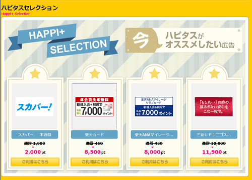 ハピタスは、このようなおすすめの広告を随時、教えてくれます。こうした広告やタイムセール中のそれは普段よりも還元されるポイントがUPするので、気になる広告はこういうよりお得になる時に利用しましょう。