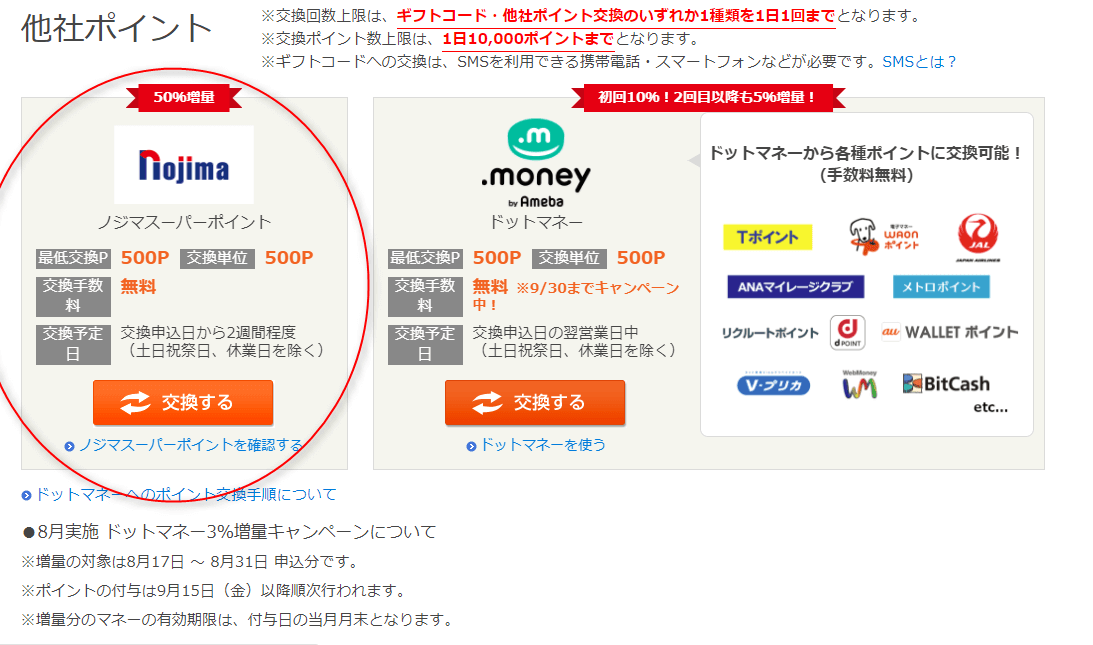 今回の肝となるのは、これです。ポイントサイトで広告サービスを利用すると、無料でポイントが手に入るので、これだけでも充分お得ですが、現金ではなく、ノジマスーパーポイントと交換すると、50%ぶん割増されたポイントを手にできるということです。
