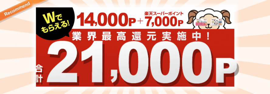 たとえば楽天カードなら現在キャンペーン中に付き、なんと、14,000円ぶんのポイントがもらえます(+楽天スーパーポイント7,000P)。