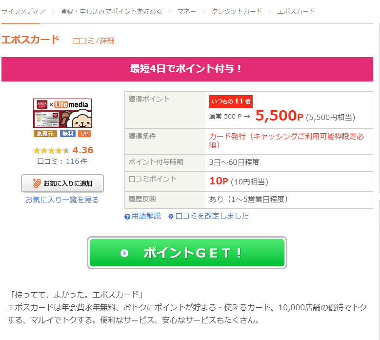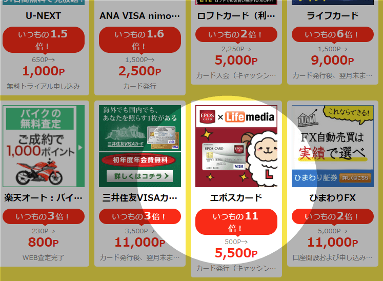 さて、もうお気づきの方もいるかもしれませんがこのエポスカードも、ポイントサイトでは楽天カード、ライフカードに並んでお馴染みの、人気のカードですので当然、ライフメディアにも……、